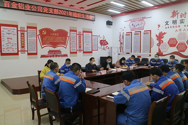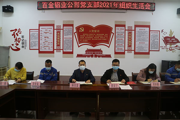 2022年3月3日上午,百金鋁業(yè)公司黨支部召開2021年組織生活會,集團公司黨委委員、副總裁麻良富到會指導,支部書記、百興金蘭公司董事長、百金鋁業(yè)公司執(zhí)行董事廖家寧主持會議。